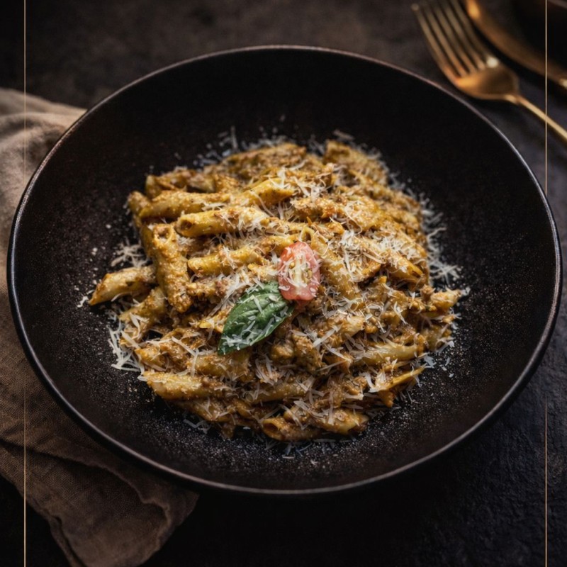 (250 سعرة حرارية)باستا ريغاتوني بصوص البيستو الخاص بمطعم بيس مع طماطم مجففة و صنوبر جبنة الموزريلا و البارميزان