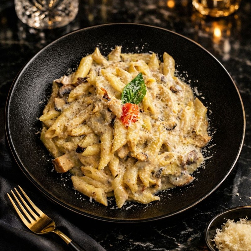 (250 سعرة حرارية)باستا بيني بالترافل و الصوص الابيض الكريمي مع جبنة البارميزان و الموزريلا و شرائح الترافل