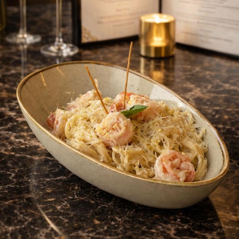 (250 سعرة حرارية)سباغيتي بالصوص الابيض الخاص مع ربيان و طعم الليمون المميز