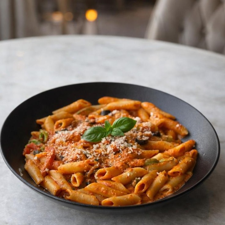 (420 سعرة حرارية)باستا بيني بتشكيلة من الخضار و صوص البنك الخاصة بمطعم بيس
