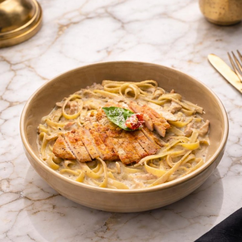 باستا فوتشيني بصوص الفريدو الخاص بمطعم بيس مع الدجاج المحلي المشوي و جبنة الموزريلا و البارميزان